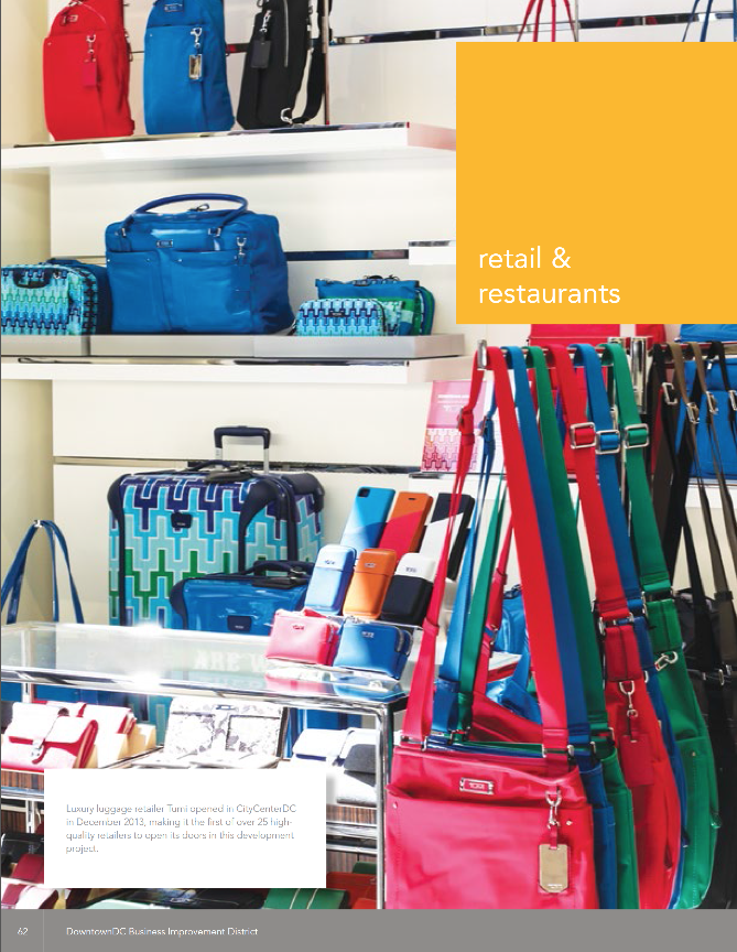 The largest Downtown retail opening in 2013 was Marshall’s in the National Press Building. Macy’s Department Store on G Street between 12th and 13th streets and Gallery Place’s retail, next to the Verizon Center, both contribute to the mixed-use vitality throughout the Downtown. The only recent destination retail closing in Downtown was the closing of Guess in April 2014.