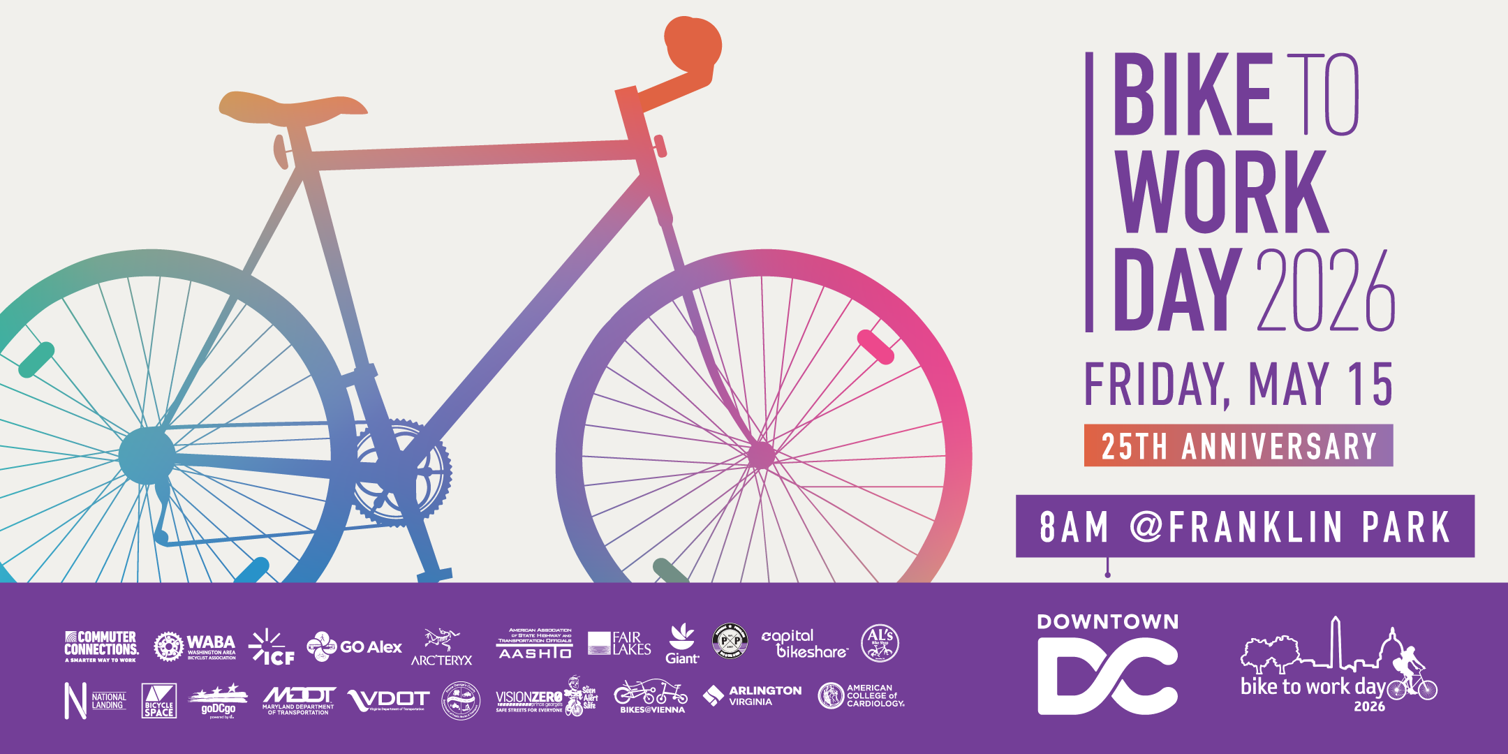 Traffic, long lines, and congestion—trade them all for fresh air and good vibes at Bike To Work Day 2026. Set your alarm and roll into Franklin Park on Thursday, May 15, from 7:00 a.m. – 9:00 a.m., where your ordinary commute transforms into a morning celebration. Sip free coffee, grab tasty treats, enjoy live music, connect with our community and snag a FREE T-shirt when signing up HERE.